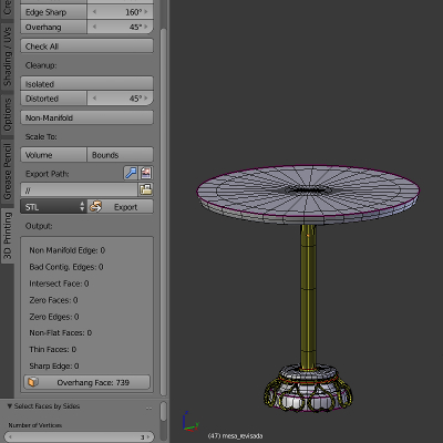 El modelo es un objeto con una malla manifold de 3.456 quads (100%). No tiene caras interseccionadas ni distorsionadas más de 45 grados, y cumple la mayoría de puntos de control del addon 3D print toolbox para Blender. Se adjunta más abajo una captura con los resultados del addon. Para construir la malla se recicló la que se había creado para el modelo del anillo de compromiso, repetida 2 veces. Los 8 corazones que engarzaban el diamante sujetan el tablero de la mesa y tambié se han usado en la peana.